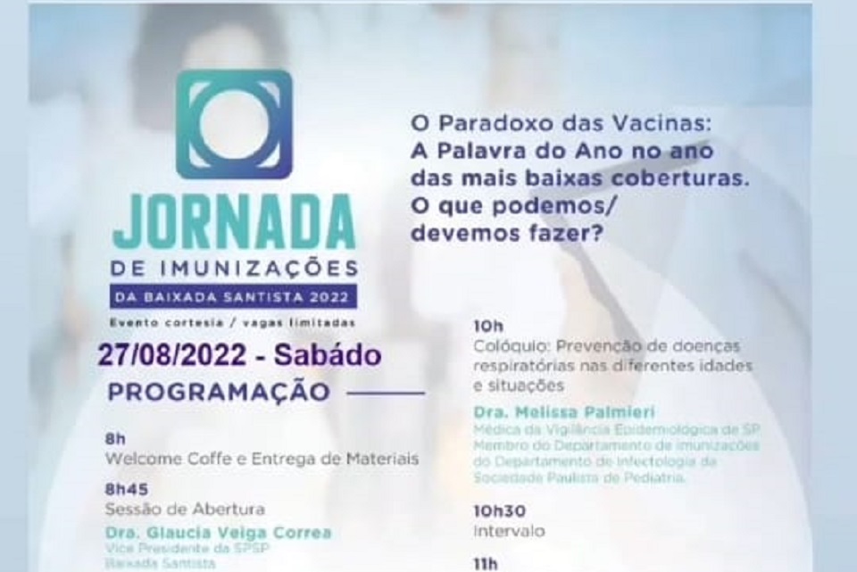 No próximo sábado, 27 de agosto, a partir das 8h, a Associação Paulista de Medicina – Santos e a Sociedade de Pediatria de São Paulo – Regional Baixada Santista promovem a Jornada de Imunizações da Baixada Santista.